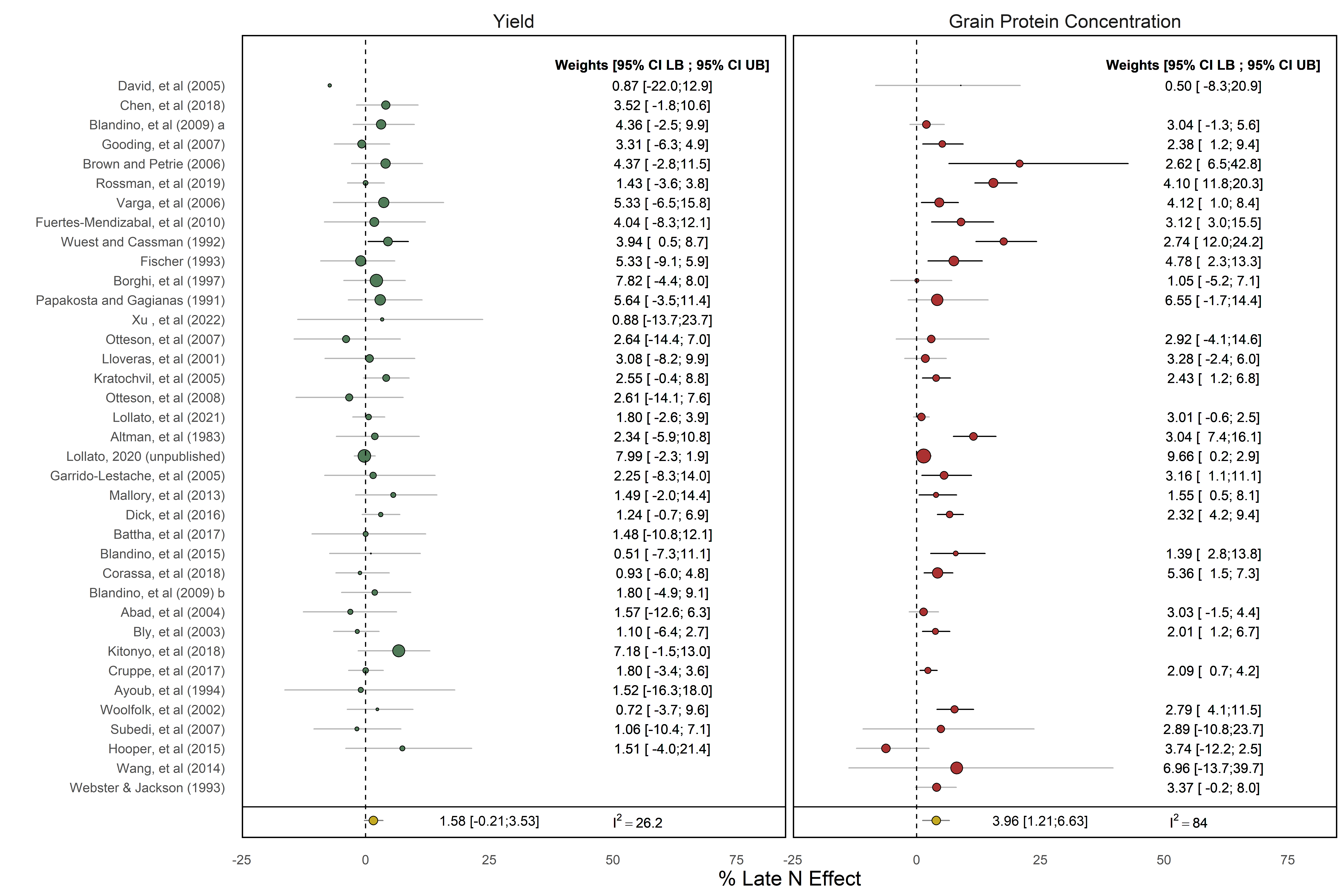 Fig. 4: Pooled effects for grain yield (green symbols) and grain protein concentration (red symbols). Symbols and their whiskers represent the mean effect and 95 % bootstrapped CI for each of the studies in this analysis. The yellow symbols are the mean estimate and its 95 % bootstrapped confidence interval. Opacity of whiskers is relative to the significance of each estimate, and size of the points is relative to the weight of each study. Studies are sorted according to the mean yield of the basal N treatment in each study in decreasing order from top to bottom. Abbreviations: confidence interval (CI), lower bound (LB), upper bound (UB), I2 = I-squared statistic (%).
